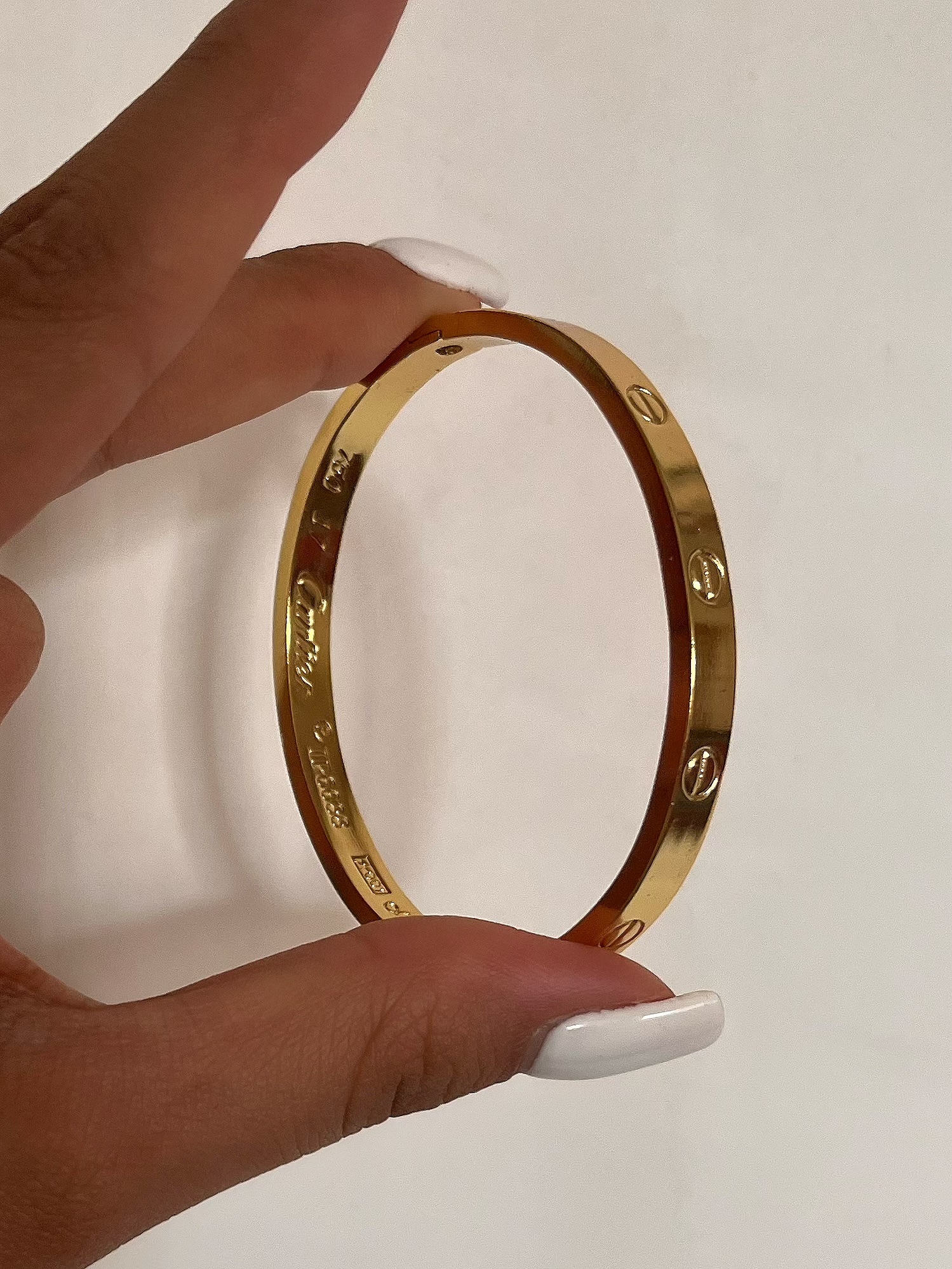 بنگل کارتیه گلد ✅ ابکاری شده ✅دارای گارانتی ✅دارای حک کارتیه قطر بزرگ بنگل ۶ سانتی متر و قطر کوچک بنگل ۵ سانتی متر هست. ❌حین استحمام استفاده نشود ❌از اسپری کردن عطر و ادکلن بر روی محصول خودداری کنید.
